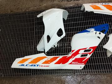 forcellone 100 euro, forcelle anteriori 200 , ruote 80 euro cad, telaio posteriore con sottocoda 200, serbatoio 50, blocchetto chiave 40, blocco motore senza gruppo termico 330, pinze anteriori 70, posteriore 30,sella da rifoderare 30 euro. tutto in blocco 1000 euro. il prezzo in inserzione è per le sole carene, prezzi non trattabili sono pezzi introvabili