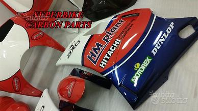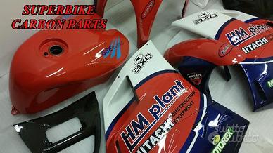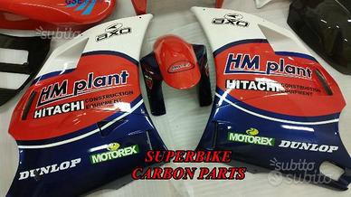carene monoposto ducati con serbatoio, parafango anteriore, parafango posteriore in carbonio e triangolo protezione radiatore in carbonio.