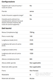 Rimorchio specializzato per il trasporto di moto, con timone basculante e guida corsa retrattile sotto il piano di trasporto. Telaio in lamiera d'acciaio zincata piegata e imbullonata, con molti punti di fissaggio per le cinghie di trasporto. Maniglia regolabile per bloccare la ruota della moto per il trasporto.
