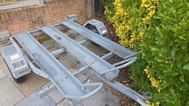 Carrello per trasporto di 3 moto. Caricamento con pianale basculante. Portata max 600 Kg. Ottimo stato. Revisione da fare. Voltura a carico del compratore. Non consegno, non ho più l'auto col gancio. Per favore astenersi perdi tempo.