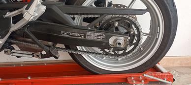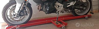 Carrello spostamento per moto con supporto cavalletto laterale Questo porta moto è ideale per manovrare facilmente una moto dotata di cavalletto laterale in un garage o in un'officina. Il carico massimo è di 565 kg. Il carrello da moto supporta un singolo motociclo o una bicicletta sportiva con supporto laterale, che pesano fino a 565 kg. Facile da manovrare in laboratorio o in garage. La leva anteriore e posteriore con funzionamento a cuneo facilita le operazioni di carico e scarico. Piattaforma di supporto laterale in cinque posizioni, adatta a numerosi supporti laterali. Perni anteriori e posteriori in acciaio per mantenere la moto sul carrello durante il movimento e doppie ruote orientabili permettono di girare facilmente. Consegna a mano non spedisco essendo piuttosto Ingombrante