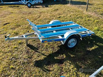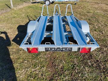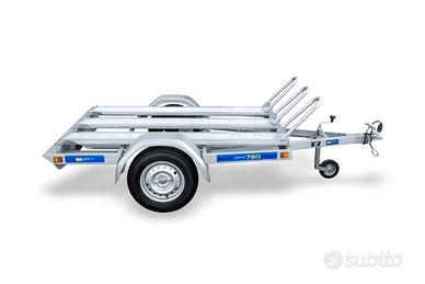 Modello MOTO 750 a una massa complessiva di 750 kg e massa utile dell' carico 580 kg a 3 binari con fermo ruota prevista per trasporto di 3 moto con la rampa per caricare le moto.E un rimorchio versatile e stabile sula strada.