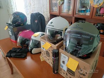 vendo in lotto o singolarmente 4 caschi jet con visiera e uno integrale, usati pochissimo (3 o 4 volte sfoderabili e lavabili ma vi garantisco che ancora profumano di nuovo) e uno nuovo mai usato ancora nella sua sacca di protezione e con pellicole. i prezzi dei caschi nuovi e seminuovi sono stati scontati di circa il 30/40% rispetto a quanto costati a me, quelli usati li svendo a prezzi simbolici trattabili. casco integrale bianco taglia L, casco jet bianco XL, casco verde oliva XL, casco fuxia S, casco nero S. ci sono anche gli annunci singoli per maggiori info. ho anche tanti altri accessori MAI UTILIZZATI porta cellulare da manubrio professionale, zaino Ducati, borsa posteriore per cafè racer verde militare, guanti in pelle e sotto-guanti, reti elastiche varie, telo coprimoto ecc che svendo a prezzo di realizzo perché ho smesso di andare in moto quasi subito per problemi di salute. NON CONTATTATEMI PER OFFERTE AL RIBASSO, tratto solo di persona con chi viene a vedere la merce