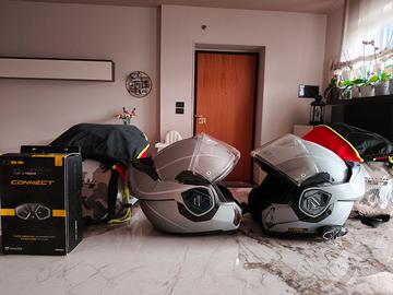 Vendo caschi da moto usati una sola volta, misura L + M con interfono mai caricato i cavi sono integri nella confezione, la mentoniera si ribalta completamente, insieme ci sono i copri casco e lo zainetto