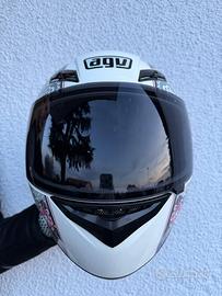 Casco da donna della AGV per moto di colore bianco con rifiniture grigie e rosa floreali. Condizioni ottime. Visiera nera con adesivo della monster rimovibile.