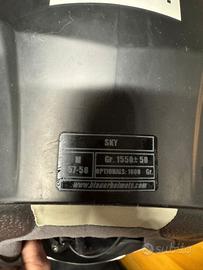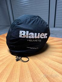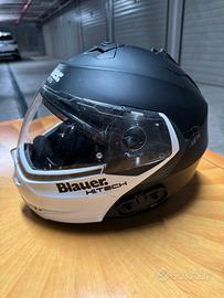 Casco modulare Blauer Helmets modello Sky di colore nero opaco e bianco. Questo casco modulare è realizzato in policarbonato ed è caratterizzato da un design della parte anteriore molto particolare e caratteristico. La mentoniera si alza con facilità tramite un unico pulsante esterno, azionabile con una delle due mani, anche con i guanti. Molto utile è la visierina scura parasole che è presente all'interno del casco, che cala sugli occhi azionando un comando nella parte superiore della calotta. Gli interni sono totalmente estraibili per il lavaggio e sono presenti varie prese aria per la ventilazione. Cinturino di chiusura a sgancio rapido con regolazione micrometrica. Doppia omologazione P/J: Integrale e jet. Peso 1550 grammi. Taglia M