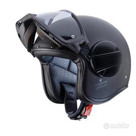 Casco Caberg Ghost X Matt Black helmet GHOST X è il casco ideato da Caberg, omologato ECE 22.06, per i motociclisti che non vogliono passare inosservati: un modello in cui forma e stile aggressivo si uniscono ad una funzionalità e praticità uniche sul mercato. Questo Jet è infatti equipaggiato con una particolare visiera a forma di occhiale che aderisce al viso grazie alla spugna presente sul profilo inferiore della stessa, oltre ad una maschera che protegge il viso dagli agenti atmosferici e dagli insetti. Grazie ad un meccanismo basculante a molle, il movimento di apertura e chiusura dell'insieme di visiera e maschera e semplice e intuitivo e può essere eseguito con estrema facilità utilizzando solo una mano (a differenza dei caschi Jet con occhiali o maschere con il tradizionale elastico). Il GHOST X può essere facilmente utilizzato in 4 configurazioni: 1) completo di visiera, profilo inferiore visiera in spugna e maschera; 2) completo di visiera senza profilo inferiore in spugna e con maschera (ideale nei mesi caldi, ma con la sicurezza della protezione del viso da parte della maschera); 3) completo di visiera e profilo inferiore visiera in spugna e senza maschera; 4) solo con visiera, senza il profilo inferiore visiera in spugna e senza la maschera. La calotta, realizzata in tre misure, è in fibre di vetro; è inoltre disponibile anche la versione FULL CARBON con calotta interamente realizzata in Carbonio. La visiera è trattata antigraffio e anti-fog per evitare l'appannamento anche nelle condizioni di massima umidità. Gli interni, completamente rimovibili e lavabili, sono realizzati con tessuti traspiranti e anallergici. Le finiture come i cinque rivetti affogati nel bordo calotta, le prese d'aria in acciaio poste sul paranuca e gli inserti in eco pelle dimostrano l' e la cura dei dettagli caratteristiche di un prodotto tutto italiano. Grazie agli spazi per gli speakers, presenti sotto l'interno estraibile, GHOST X può essere equipaggiato con il comun