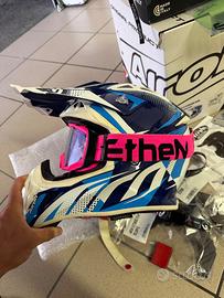 100% Carbon Kevl-ar, traspirabilita’ e ventilazione top, filtro anti polvere.. accessori: kit go pro, coperture per pioggia e fango, kit viti attrezzi.. uno tra i caschi più leggeri e performanti della sua categoria. Mascherina ethen nuova con sua confezione e kit per cambiare le protezioni sulla visiera.. pagata 99 euro solo quella… che regalo… I punti di forza in questa nuova versione sono la leggerezza ulteriormente implementata, il campo visivo ampliato, la nuova presa d’aria mentoniera, il nuovo spoiler posteriore e il nuovo frontino che garantisce la massima protezione. Calotta esterna stratificata con il sistema multi axial in fibre composite di carbonio e Fibra Aramidica preimpregnato epossidico aeronautico stampato ad alta temperatura.