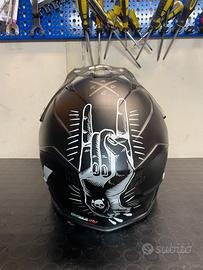 Il casco presenta qualche segno lieve, manca il guanciale destro e una parte in gomma si è leggermente scollata.
