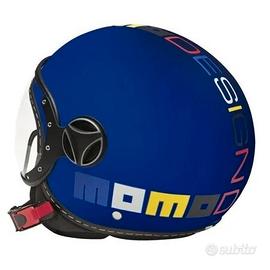 Casco da moto da bambino Momo Design modello FGTR Baby, colore blu opaco. Il Momo FGRT Baby è un piccolo casco Jet omologato e studiato per i più piccoli. Ha la calotta in policarbonato ABS molto compatta e leggera, caratterizzata dalla livrea con loghi Momo Design in caratteri multicolore, e dotata della visiera in stile aeronautico che ha reso famoso il brand.
