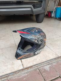 casco da cross senza omologazione. usato pochissimi giorni da mio figlio poi venduta moto. leggermente staccato il gommino