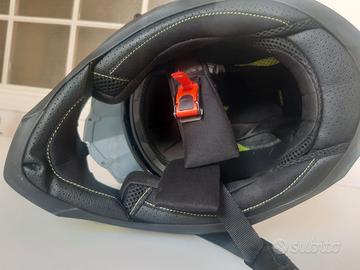 Casco integrale da fuoristrada in fibra di vetro, usato due volte taglia M Visiera regolabile in policarbonato Visiera trasparente apribile e staccabile per permettere l'utilizzo di una maschera Doppia visiera solare interna Ventilazione ottimale con le sue aerazioni frontali e i suoi estrattori posteriori Mentoniera dotata di ventilazioni regolabili Interno completamente estraibile e lavabile Chiusura del sottogola con una fibbia micrometrica Casco con certificazione ECE 22/-05