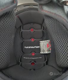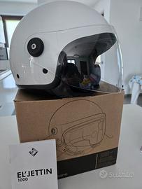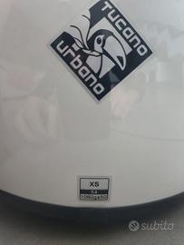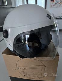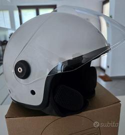 Casco moto demi-jet in policarbonato, a doppia calotta, omologato. Colore bianco ghiaccio lucido, taglia XS 54 cm, ottimo stato. Completo di scatola, istruzioni e contenitore. Ritiro in loco, no spedizione
