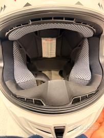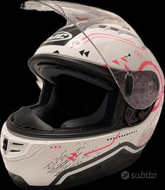 Vendo casco hjc taglia S, fondo bianco con dettagli rosa, in eccellenti condizioni, senza graffi e usato forse 5/6 volte. Come nuovo. Lo vendo perché ho venduto la moto e ho comprato i nuovi abbinati alla nuova moto.