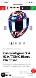 Casco integrale Givi 50.9 ATOMIC Bianco Blu Rosso taglia XL, usato una volta, in perfette condizioni. Completo di visierino parasole integrato, lente pinlock inclusa. Taglia XL 61 cm Prezzo 85€.