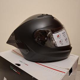 Casco integrale in policarbonato con ampio spoiler posteriore. Doppia visiera panoramica (trasparente e dark smoke). Lente pin lock inclusa. Imbottitura interna rimovibile e lavabile. Colorazione Classico 302 (nero opaco). Peso ca: 1480 +/-50gr Vendo per taglia errata. Prezzo leggermente trattabile.