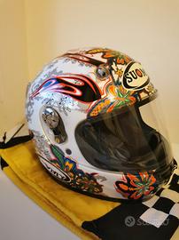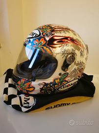 Casco indossato pochissime volte, come nuovo, mai caduto, non un graffio, taglia xs; lo vendo per totale inutilizzo. Il casco è molto bello e particolare, come d'altronde tutti i caschi della suomy, colorato con base bianca glitterata, fiori e fiamme rosse e di altri colori.
