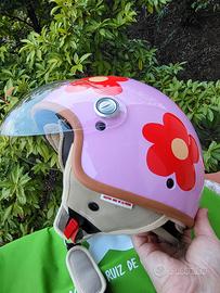 Bellissimo casco da moto Agatha Ruiz de la Prada con fantasia naif. Il casco jet, prodotto dalla Lem, ha la calotta esterna in materiale termoplastico, la visiera in policarbonato, il rivestimento interno in velluto traspirante, completamente rimovibile e lavabile. Il peso, piuttosto ridotto, è di 950 gr. Taglia XS (circonferenza testa 53 cm).
