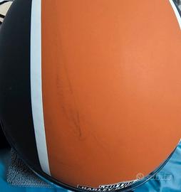 Il casco è stato comprato e mai utilizzato. Presenta sulla parte anteriore una macchia da sfregamento (visibile in foto), a causa della prolungata conservazione all'interno della sua sacca. Dotato di sacco originale. Taglia XL.