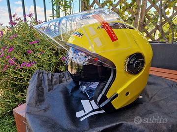 Casco Jet in policarbonato. ECE 22-06 omologato. TG M. 57-58 CM. Visiera trasparente antigraffio Lunga + Visiera interna parasole. Levetta facile da usare per il cambio rapido da una visiera all'altra. Prese d'aria frontali regolabili. Estrattori d'aria posteriori. Fodera completamente smontabile e lavabile Guanciali amovibili. Comodo da indossare. Rivestimento antibatterico. Chiusura micrometrica.