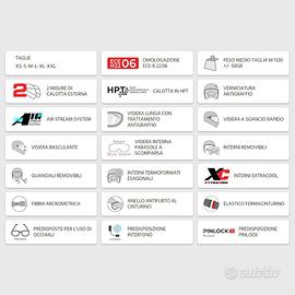 Il casco, realizzato in due misure di calotta esterna per un miglior comfort di calzata, è dotato di interni termoformati esagonali dal tessuto Extracool, con predisposizione interfono e per l'uso di occhiali.