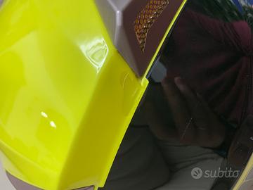 Vendo casco tipo “jet” marca Motocubo taglia M (per circonferenza testa da 57 a 58 cm). Ampia visiera modulabile in 3 posizioni (tutta aperta, aperta a meta’ o completamente abbassata), integrata da visierina interna scura antisole alzabile ed abbassabile con comoda leva esterna. Cinturino di chiusura con regolazione micrometrica. Interno perfetto, estraibile e lavabile. Prese d’aria sulla fronte regolabili aperte/chiuse. Mai caduto o danneggiato, utlizzato pochissimo. Presenta una sola imperfezione (visibile in foto) nella vernicaitura sulla parte posteriore vicino allo sfiato dell’aria. Colore giallo limone/nero, ideale per rendersi visibili nel traffico. completo di sacca originale per riporlo.
