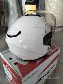 casco Jet tenuto in ottime condizioni, usato pochissimo, senza un graffio visiere come nuove, dotato di visiera grande trasparente e visiera parasole a scomparsa. imballo e sacca originale. prezzo richiesto 50 euro