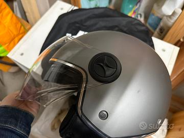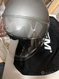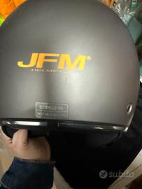 Casco JFM modello 500 nel colore Antracite Opaco. casco demi-jet, pensato principalmente per l'uso urbano con scooter o piccole moto. Omologazione: ECE 22.06, che è l'ultima e più rigorosa normativa europea in termini di sicurezza (più sicura della vecchia 22.05). • Peso: Circa 1180g ± 50g Modello "a elicotterista" sagomata (come si vede dall'anteprima sulla scatola), con trattamento antigraffio; seconda visiera per il sole. Vedi foto Cinturino con fibbia a sgancio rapido e regolazione micrometrica. Ricevuto in regalo lo scorso luglio, utilizzato poche volte, completo di scatola e sacca portacasco. vendo per inutilizzo