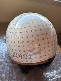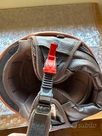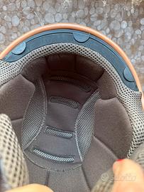 Il casco è in ottimo stato interno. È anche la parte in pelle è come nuova.L’esterno è un po’ graffiato dal posizionamento nel bauletto e nel sotto sella. Il difetto è che Non ha la visiera che purtroppo ho rovinato e quindi rimosso. La parte per coprire il collo e le orecchie è di pelle e si può staccare tramite zip.