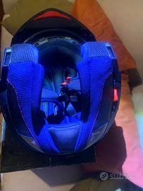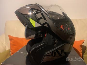 Ottimo casco modulare MT-Hemets W17-S Grigio con inserti Giallo-Fluo, bello nella forma e nei colori. Dotato di una buona imbottitura, comodo e confortevole. Ha una lente interna anti UV(parasole) apribile tramite switch posto sul lato sinistra alla base della calotta. Anche se la misura è una S (54-54 cm) l’ho indossato senza difficoltà considerando che la mia circonferenza è 56 cm. Quindi andrebbe bene sia a chi ha una 55 cm di circonferenza che ad una 56 cm. Ha avuto breve vita, qualche mesto e messo a riposo per evenienza. Sulle parti giallo-fluo avevo applicato della pellicola prima rossa (avevo cambiato moto) e poi verde per passarlo a mia moglie motociclista anche lei. Alla fine è stato indossato poco. Sulle parti giallo-fluo c’è rimasto qualche lieve residuo della colla della pellicola che però non ne inficia la bellezza o l’aerodinamica. Ovviamente nuovo costerebbe molto di più e soprattutto non è un casco cinese!