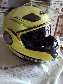 Casco modulare in tecnopolimero giallo fluo. Omologazione P/J ECE 22.05. Leggermente sbiadito sulla calotta. Taglia L . Peso gr 1780. Sistema di aerazione mentoniera e calotta. Visierino parasole fume' a scomparsa. Interno smontabile e lavabile.