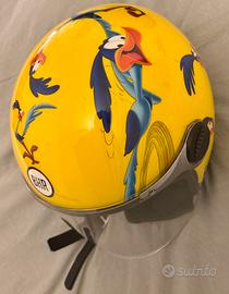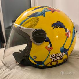Casco jet/open face, colore giallo con grafica Road Runner, molto leggero (circa 900 g), comodo per uso urbano e scooter.