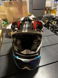 Casco Moto Cross in Fibra Just 1 J12 Dominator taglia XS multicolor + maschera. Ottime condizioni, ha solo una parte di visiera staccata da incollare