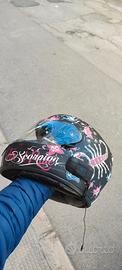 Casco integrale Scorpion EXO-390 da donna, rosa, taglia S (55-56 cm). Leggero, aerodinamico, adatto a moto e scooter. Predisposto per interfono (non incluso). Mostra segni di usura visibili in foto, struttura integra. Offre protezione e comfort, ideale come primo casco.