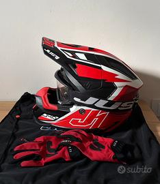 Casco Moto per motocross, marca J1 modello J40 con grafica “Flash Matt”. Colori rosso, nero e bianco. Taglia M. Nel prezzo sono inclusi anche la scatola e la sacca originaria, i guanti abbinati e gli occhiali abbinati, come mostrati dalle foto. Condizioni più che ottime, il casco risulta come nuovo, utilizzato pochissimo.