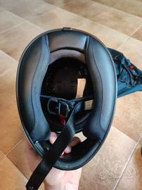 Casco HJC bianco, peso 1400g, taglia M 58, con prese d'aria, seconda visiera parasole interna, con laccio omologato anche per pista.