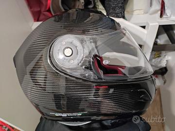 Casco moto integrale con un guscio prodotto in fibre composite, estremamente leggero e resistente, molto ventilato e super silenzioso.