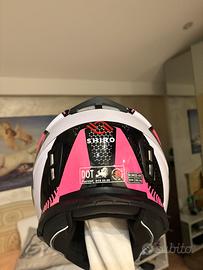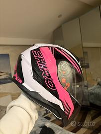 Vendo casco integrale SHIRO taglia S (55-56 cm), omologato ECE 22.05 e DOT, colore bianco, nero e fucsia con design sportivo e accattivante.