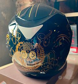 Vendo bellissimo casco integrale, usato pochissimo ed esclusivamente indossando il sottocasco. Nero con decorazioni oro, adesivi riflettenti obbligatori in Francia. Compresa borsa in tela originale porta casco.