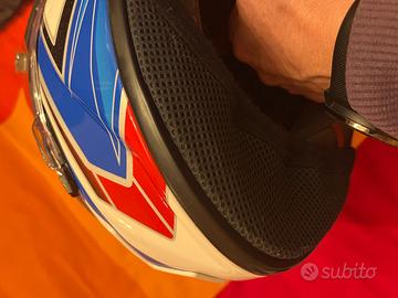 Qualche info sul casco: vari strati di fibre di vetro, Kevlar ed organiche ,interni, completamente staccabili per il lavaggio, modulabili in inclinazione per adattare la posizione del casco al meglio con quella di guida.