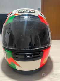 Casco AGV versione Imola 98 di Valentino Rossi ..modello ricercato ..uso collezionistico in quanto a quasi 30 anni (interni e fascia di plastica sottocasco da rivedere) alcuni segni visibili in foto ..ma in generale e’ancora un bellissimo casco ..credo taglia M.per info scrivetemi