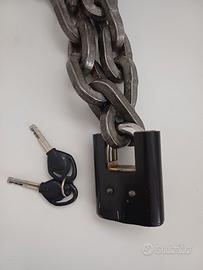 Catena in acciaio cementato per moto a maglia quadra spessore 10 mm., lunghezza 150 cm., estremità a cappio per una maggiore sicurezza, resistente a taglio, usura, seghe, tronchesi, ecc., lucchetto in acciaio di massima sicurezza