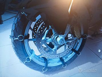 Vendo catene da neve da moto per ruote 120/70 r 17 e 180/55 r 17 , adatte a BMW RT preparate appositamente per partecipare al Elefantentreffen e mai usate.