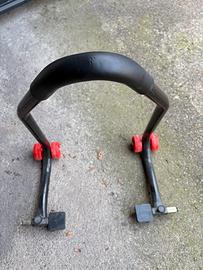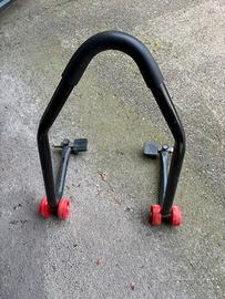 Cavalletto posteriore universale per moto con supporti a gomma regolabili (larghezza circa 32-43 cm). Struttura in acciaio nero con doppie ruote rosse per massima stabilità durante la manutenzione.