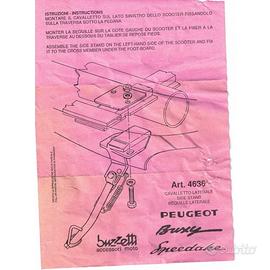 (R16117) Vendo cavalletto laterale nuovo per Peugeot Buxy - Speedake marchiato Buzzetti di colore argento con scritta nera e staffa zincata oro con codice 4636 , per istruzioni di montaggio vedere foto