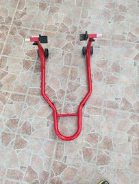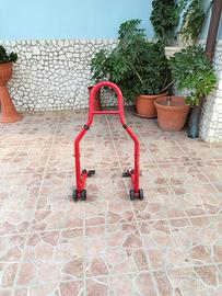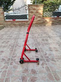 Cavalletto anteriore o posteriore per moto con attacchi a piastra in gomma, regolabili. Dotato di ruote per una facile movimentazione e con portata massima di 300kg.