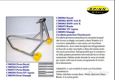 Cavalletto posteriore monobraccio con perno in ergal che lavora su doppi cuscinetti a sfera. Fornito in 4 versioni è adattabile a varie moto con forcellone monobraccio. Asse ruota in ergal con alloggiamento in boccola su due cuscinetti a stera che danno moto alla ruota posteriore. Indispensabile per la sostituzione della gomma posteriore ed eventuali lavori di manutenzione. Ottimo anche durante la sosta invernale per tenere sollevata la ruota scongiurando il rischio di ovalizzazione.
