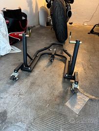 Vendo cavalletto posteriore per moto con supporti a “V” regolabili e ruote pivottanti.