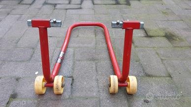 Vendo cavalletto moto universale per sollevare la ruota anteriore, si posiziona sotto alle forcelle per mezzo di nottolini regolabili in modo semplice, veloce e sicuro.