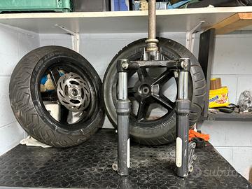 Vendo bellissimi cerchioni da 12 pollici originali per Booster Spirit o yamaha bws , gomme seminuove al 90% di battistrada residuo , metzeller post, michelin anter , disco freno a Margherita Nuovo, eventualmente dispongo anche della forcella originale per bws